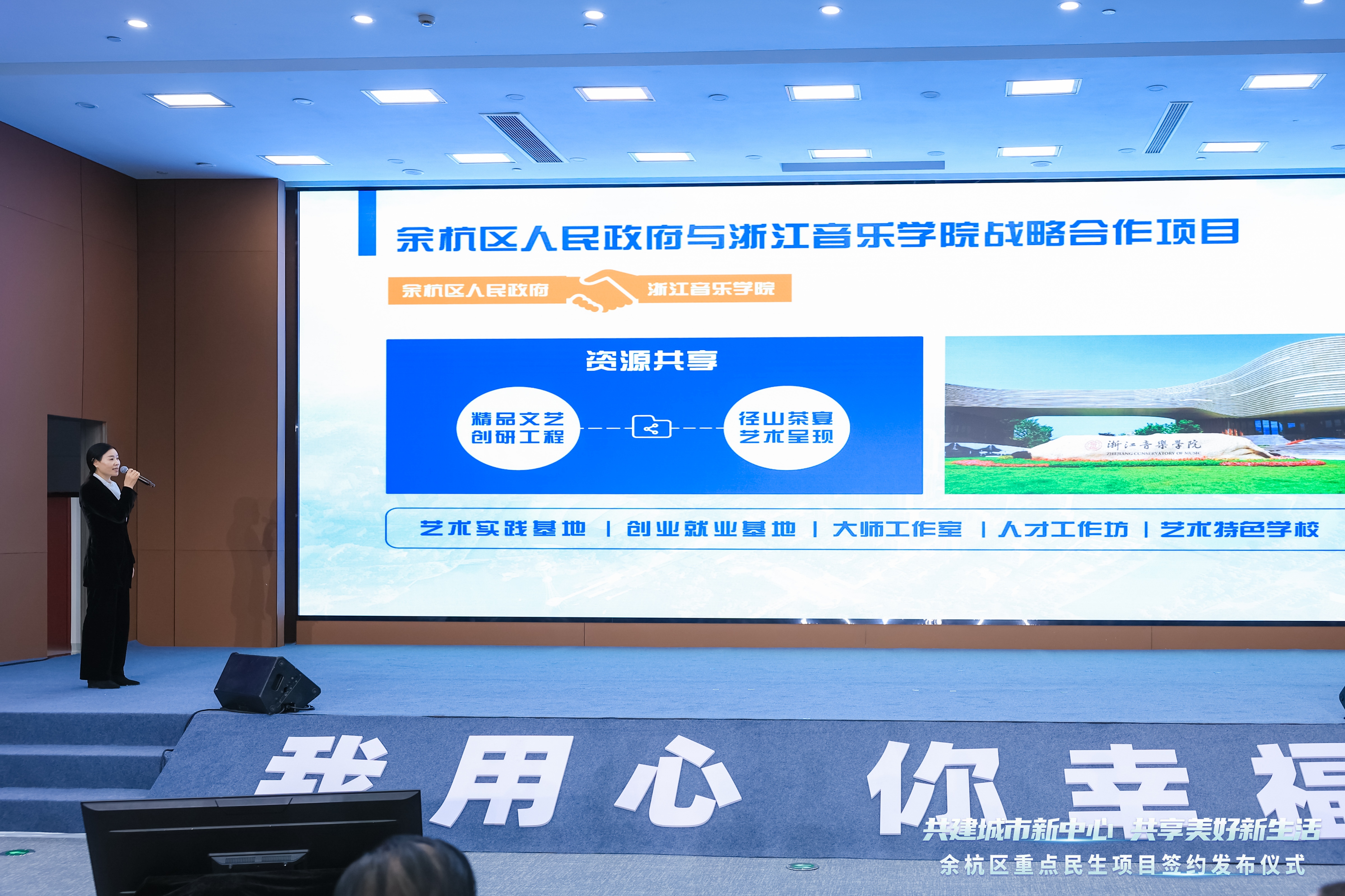 根据合作协议,学院与余杭区将围绕校地协同创新与协同育人,依托浙音在文艺资源和特色办学等方面优势,发挥余杭区作为“数字经济第一区”的产业集群效应和区域深厚的文化资源优势,推动双方在设施、人才、科创、文化、办学等方面合作,强化资源共享,实施精品文艺创演工程,开展舞台精品文艺创作,赋能余杭径山、良渚、运河三大文化特色,挂牌设立艺术实践基地、创业就业等基地,为师生专业实践、创业就业和文化服务搭建更优更广平台,推动成立一批“大师工作室”“人才工作坊”,推动余杭科技企业和科创平台与学院科研平台的产学研合作,同时发挥浙音附中集团化办学优势,合作推动音乐特色学校联合办学,助力余杭建设最具幸福感城市新中心,提升余杭群众生活品质,实现精神全面共富。