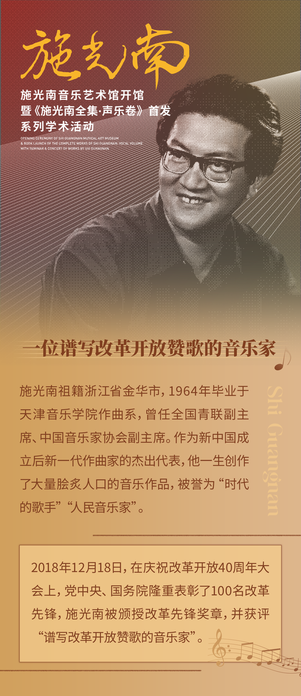 徜徉在环形布展的施光南音乐艺术馆内,跟随“生平往事”“时代歌手”和“辉煌成就”三个展区的介绍指引,3000余页珍贵创作手稿、700余册图书、400余件音像资料,以及大量施光南的生前生活用品、奖品奖状、研究成果、新闻报道和采访实录等艺术珍品,在声、光、电等现代综合展陈技术的衬托下,向世人娓娓讲述施光南这位“人民艺术家”充满传奇色彩的音乐人生。