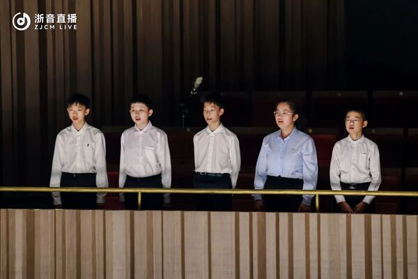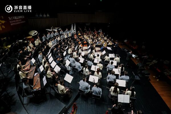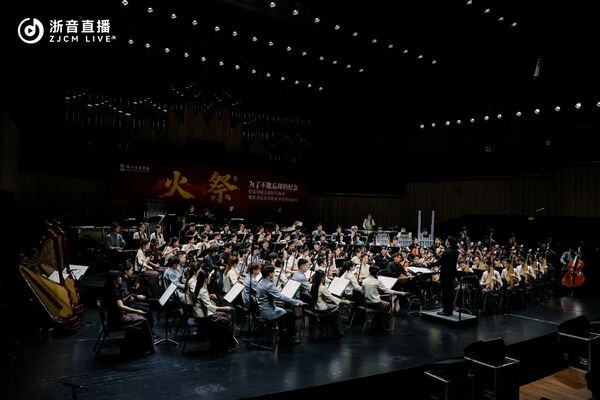 谭盾创作的拉弦乐器协奏曲《火祭》堪称整场演出的灵魂。曲目由乐团艺术总监王甫建执棒,国乐系青年教师薛辰茜与乐团青年二胡演奏家裴文钰先后以中胡、二胡、高胡三种音色构筑出当代音乐的舞台祭祀,意韵深刻、悠长,在民族管弦乐队的烘托下层层递进,再配合浙音附属音乐学校合唱团的童声合唱,将对民族悲剧的追思、对战争亡灵的祭奠与对和平的期盼熔于一炉。尤其当 “祭祀、自然、民俗” 三大音乐“色彩块”在舞台上交织叠置,时而松散自由,时而集中有力,现场观众无不被这份穿透时空的艺术感染力所震撼。