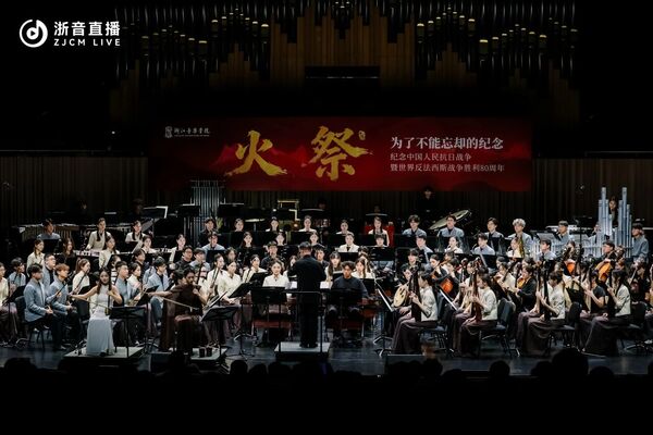 9月28日晚,浙音音乐厅内暖黄色的灯光与红色主题背景交相辉映,浙音民族室内乐团《火祭——为了不能忘却的的纪念》专场音乐会在此上演。作为乐团2025下半年乐季的开篇之作,这场以纪念中国人民抗日战争暨世界反法西斯战争胜利80周年为主题的音乐会,通过震撼人心的民族器乐演绎,完成了一次跨越时空的历史对话与精神传承。