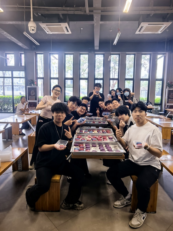 制作过程气氛热烈、欢声笑语不断,大家互相交流制作心得,分享劳动喜悦。短暂的等待烘烤间隙,师生们还纷纷合影留念,记录下这一美好瞬间。空气中弥漫着月饼香甜的味道,现场洋溢着“家”的温馨与集体的温暖,令人深刻感受到浓浓的节日祝福。