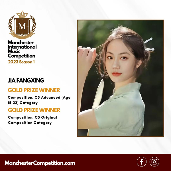 近日,来自音乐工程系音乐设计与制作专业2021级本科生贾方兴的作品Titmice Suit No.3 Survival Game《山雀组曲Ⅲ 鹰口逃生》(指导老师:姜超迁)一举获得英国曼彻斯特国际音乐比赛(Manchester International Music Competition)作曲组、高级组(18-22岁)两项金奖。