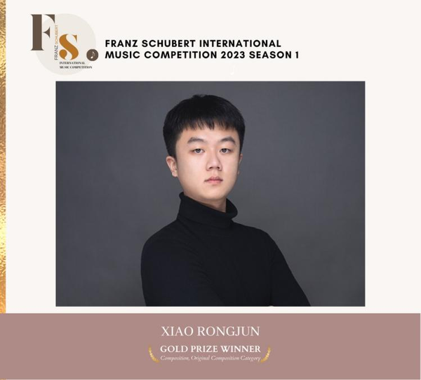这是肖荣俊同学继上个月室内乐作品《烁》(Bright)在2023弗朗茨·舒伯特国际音乐比赛(Franz Schubert International Music Competition 2023)获得金奖后再获国际奖项。