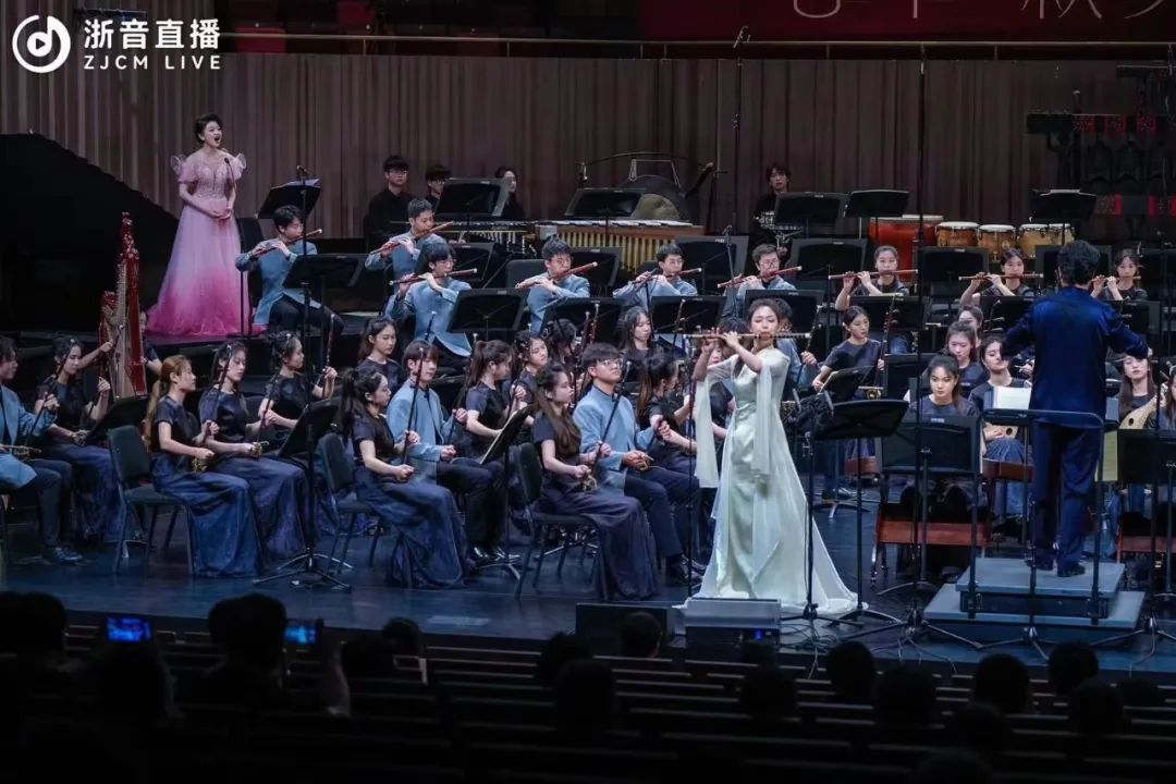 音乐会上半场由编钟与乐队《国风》开幕,本曲是赵季平的代表作之一,乐音雄浑大气,编钟的加入使乐曲更加大气磅礴,更富历史的厚重。随后,乐队演奏了王甫建教授改编的古曲《春江花月夜》,乐曲意蕴高远,一幅淡雅隽永的画卷随着音乐慢慢展开。《兰亭》与《西子歌》均为王云飞教授的作品,《兰亭》由青年古筝演奏家楼琳演奏,与乐队一起生动展现出曲水流觞的高雅意趣;青年竹笛演奏家张晶洁与青年女高音歌唱家阮妍沁共同演绎的《西子歌》,诠释了出尘脱俗的东方美学。下半场,唐建平的《大地深情》用朴实动人的音符描绘了浩瀚江河与逶迤山川,道出对祖国的深沉眷恋。青年唢呐演奏家陈铭楠带来的唢呐协奏曲《麒麟颂》, 孔志轩化用鲁西南音乐素材,以麒麟这一瑞兽寄托了美好憧憬与对天下大同的期盼。青年二胡演奏家刘宇演奏的二胡协奏曲《我的祖国》,是作曲家王丹红由歌曲改编的作品,深情的笔触佐以丰富的技巧,用器乐化的语言道出了对祖国的无尽热爱。最后,音乐会在王云飞教授《春华秋实》优美又不失积极的旋律中落下帷幕,春华秋实是自然规律,也意味着播种终将结出硕果,意味深长,含义深远。