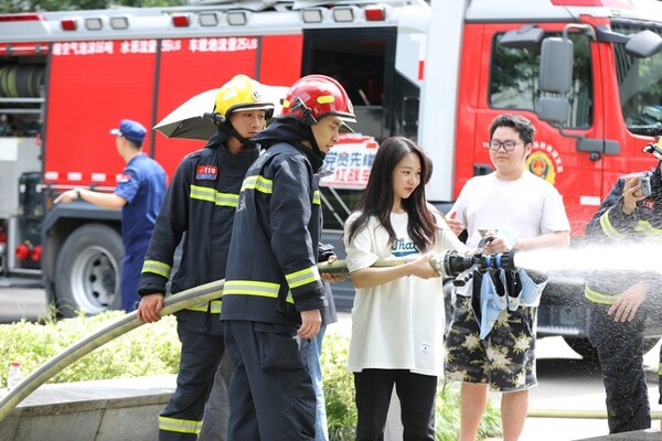 随后,演练总指挥、副院长奚丽萍宣布演练正式开始。演练分为人员逃生疏散、油盆火灾扑救两个阶段,消防监控室接到火灾报警信号后,立即指派应急分队到达现场,指挥引导楼内学生有序疏散,第一时间进行初期“火灾”扑救。当未能达到扑救效果、“火势”继续蔓延时,消防监控值班员马上拨打火警电话“119”,详细告知起火地点、燃烧物和进入校区方向,并指派交通引导人员到达学院南大门,接引消防车辆顺利进入校园登高地面。消防员分两组,一组消防登高车登高救援,另一组利用地面消火栓,向四楼外阳台出水灭火。消防员将“被困者”救出,立即转交救护组观察救护。经过学院师生与消防战士的共同努力,“火灾”被扑灭。疏散演练结束后,杭州市消防救援支队重型机械工程救援大会教导员应少惠进行点评,并对灭火器操作相关知识作了讲解和示范,随后模拟初期火情,引导师生使用灭火器进行油盆扑灭实操演练。