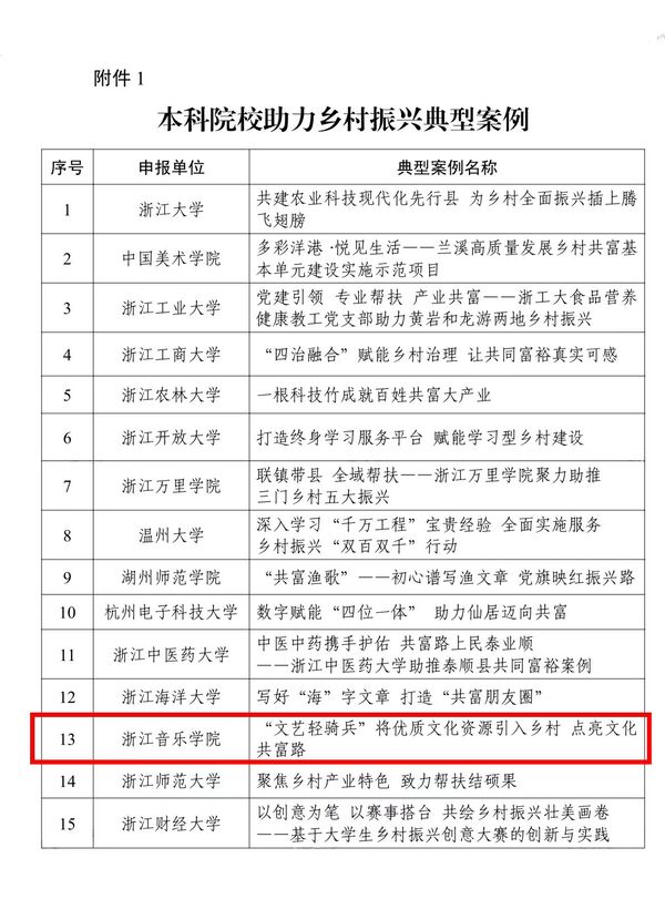 近日,经学院申报、高校互评、专家评审和省教育厅会评,我院申报的《“文艺轻骑兵”将优质文化资源引入乡村点亮文化共富路》从全省高校近百个项目中脱颖而出,成功入选“本科院校助力乡村振兴典型案例”。
