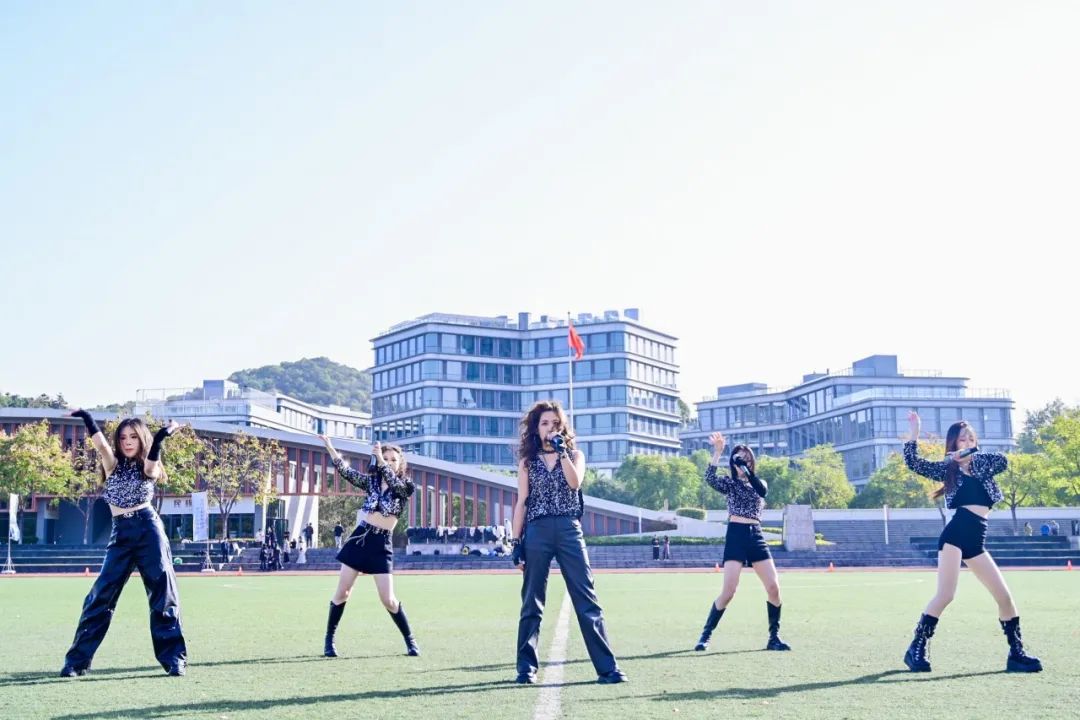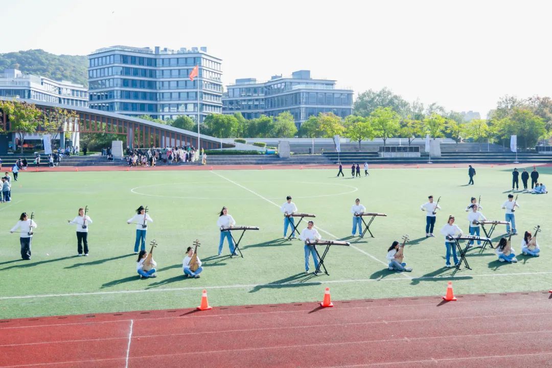 随后,开幕式演出精彩开场。国乐系带来了现代筝乐作品《星光之恋》,传统古筝演奏技法与现代音乐元素完美结合,奏响了当代大学生的青春节奏与励志音符。舞蹈学院春晚原班人马在秋日操场再跳《碇步桥》,“SaSa”女孩们重现经典,带我们走入溪水淙淙的诗画江南。流行音乐系带来唱跳作品《无尽之羽》和流行演奏《Kyddo(奇多)》,充满律动又个性张扬的演出,展现了当代青年不惧挑战、坚持自我的澎湃激情。戏剧系带来了风格迥异的传统越剧与歌舞《the greatest show》表演,温婉翩然的传统艺术与热情四射的音乐剧表演高潮迭起,令人目不暇接,仿佛一场跨越时空的艺术盛宴。