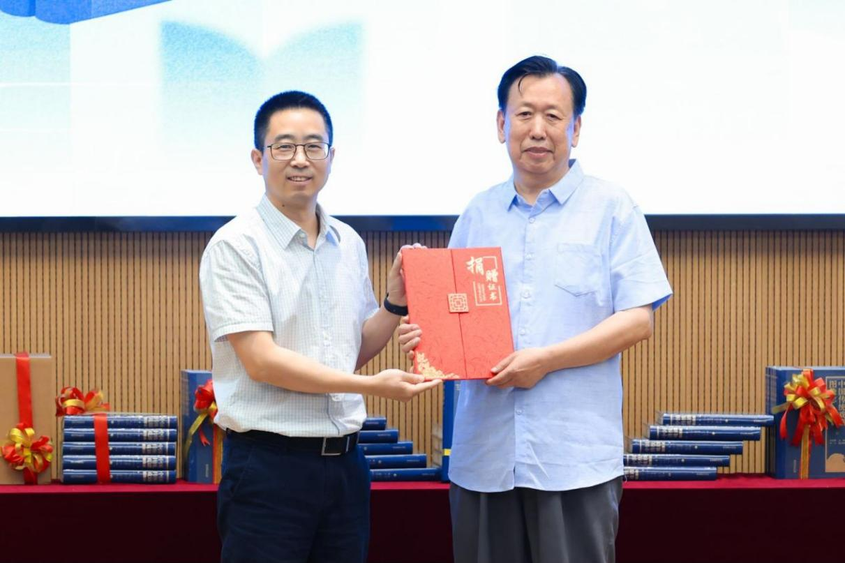 汪洋为刘文峰颁发捐赠证书,他说,这些宝贵文献资料是刘文峰研究员在学术生涯中的重要沉淀,也是戏曲史和学术史的宝贵财富,捐赠的资料丰富了浙音馆藏,完善了戏曲文献的资料建设,为浙音师生和学术界提供了宝贵的学习、研究素材,对图书馆建设和戏曲学科建设具有重要意义。