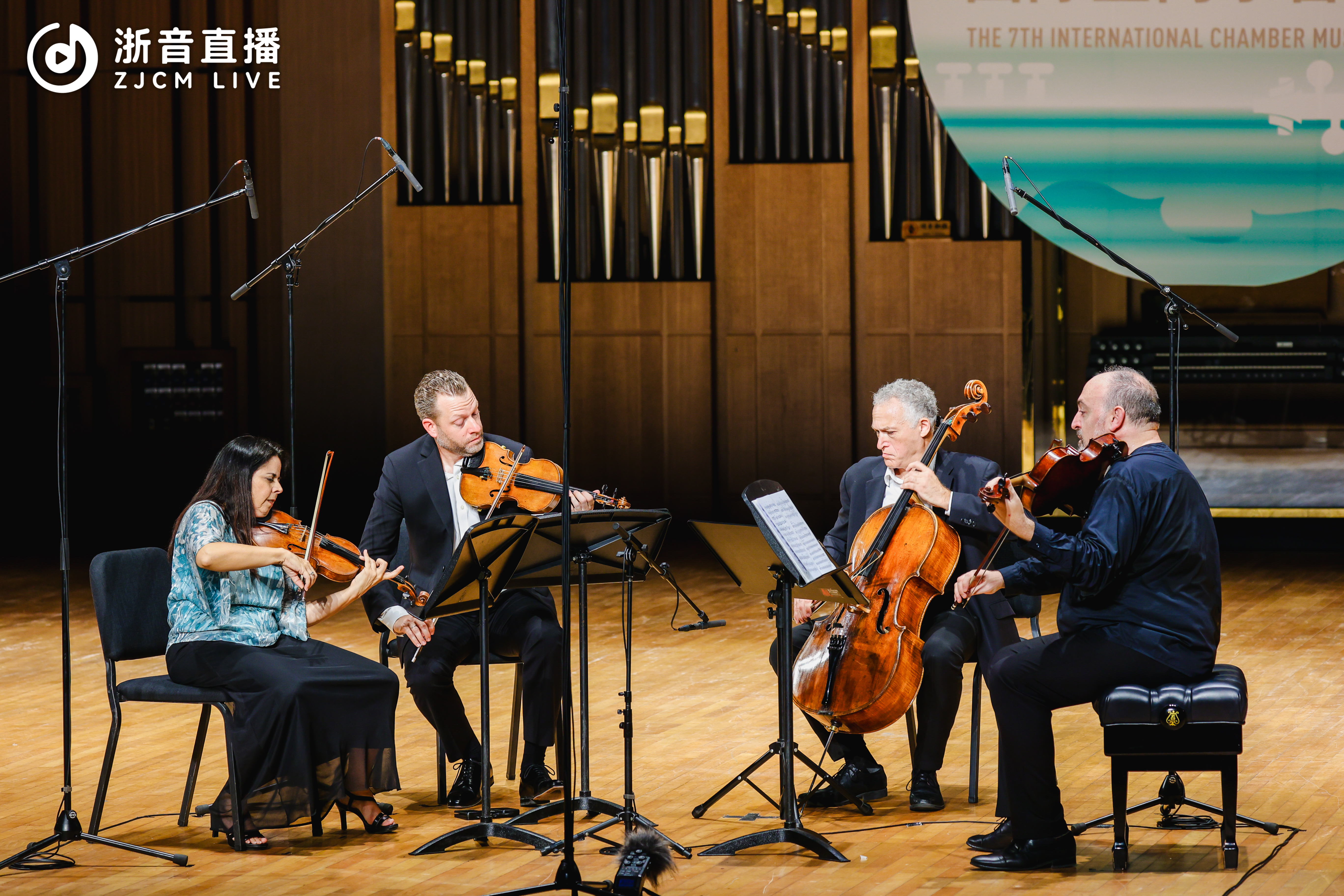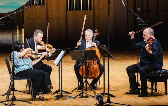第三首乐曲,也是节目单中最后一首作品,是来自俄罗斯作曲家德米特里·肖斯塔科维奇的A大调第二弦乐四重奏。这首作品曲风嘹亮激进,同时又带有忧郁哀伤。宏大的作品结构里,各式各样的色彩变化令人流连忘返。第一小提琴家西敏有着大量的独奏片段。她的琴声细腻而不失力量,变化莫测的揉弦使得琴声牢牢抓住了听众的听觉和心灵。第二小提琴家奥斯汀和中提琴家马克的配合也堪称一绝,在一旁牢牢衬托出了第一小提琴的音域。四位音乐家对于这部庞大作品的演绎,使得音乐厅爆发出了雷鸣般的掌声。