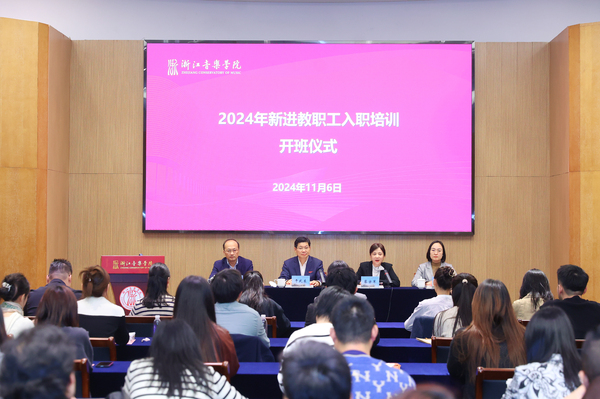 仪式上,干武东代表学院对新入职教职工表示欢迎。他总结回顾了近年学院发展取得的工作成绩,与全体新进教职工重温了习近平总书记在全国教育大会上的殷切嘱托,并对他们提出三点要求:一要坚定理想信念,始终牢记“为党育人、为国育才”的初心使命。教师承担着传播知识、传播思想、传播真理的历史使命,肩负着塑造灵魂、塑造生命、塑造新人的时代重任。要始终坚持立德树人根本任务,坚持弘扬正道,不断提高道德修养,提升人格品质,追求德艺双馨,把正确的道德观传授给学生,为学生系好“人生第一粒扣子”。二要提升能力素质,始终保持“事必尽善、精雕细琢”的进取精神。教育是一项精细的工作,艺术教育尤其需要教师的悉心引导和精心栽培。要以高度的敬业精神塑造学生品格,以精湛的学术造诣启迪学生智慧,以专业的教学技能引领学生发展,让每一位学生都有机会站上梦想的舞台,成就出彩的人生。三要勇担时代使命,始终践行“服务学校、服务发展”的责任担当。浙音既是一所高校,也是一家文化单位,除了培养艺术人才,还承担着服务国家文艺事业的使命和任务。要围绕党中央、省委省政府重要决策部署,充分发挥自身的专业优势,打造音乐艺术人才培养的摇篮,在文化强省建设的大场景中建功立业。希望全体教师主动将自己的人生规划、职业发展与学院的发展全局、改革大局紧密结合起来,全力提升人才培养能力、科学研究能力、艺术创表实力和服务社会水平,为学院高质量发展贡献力量。