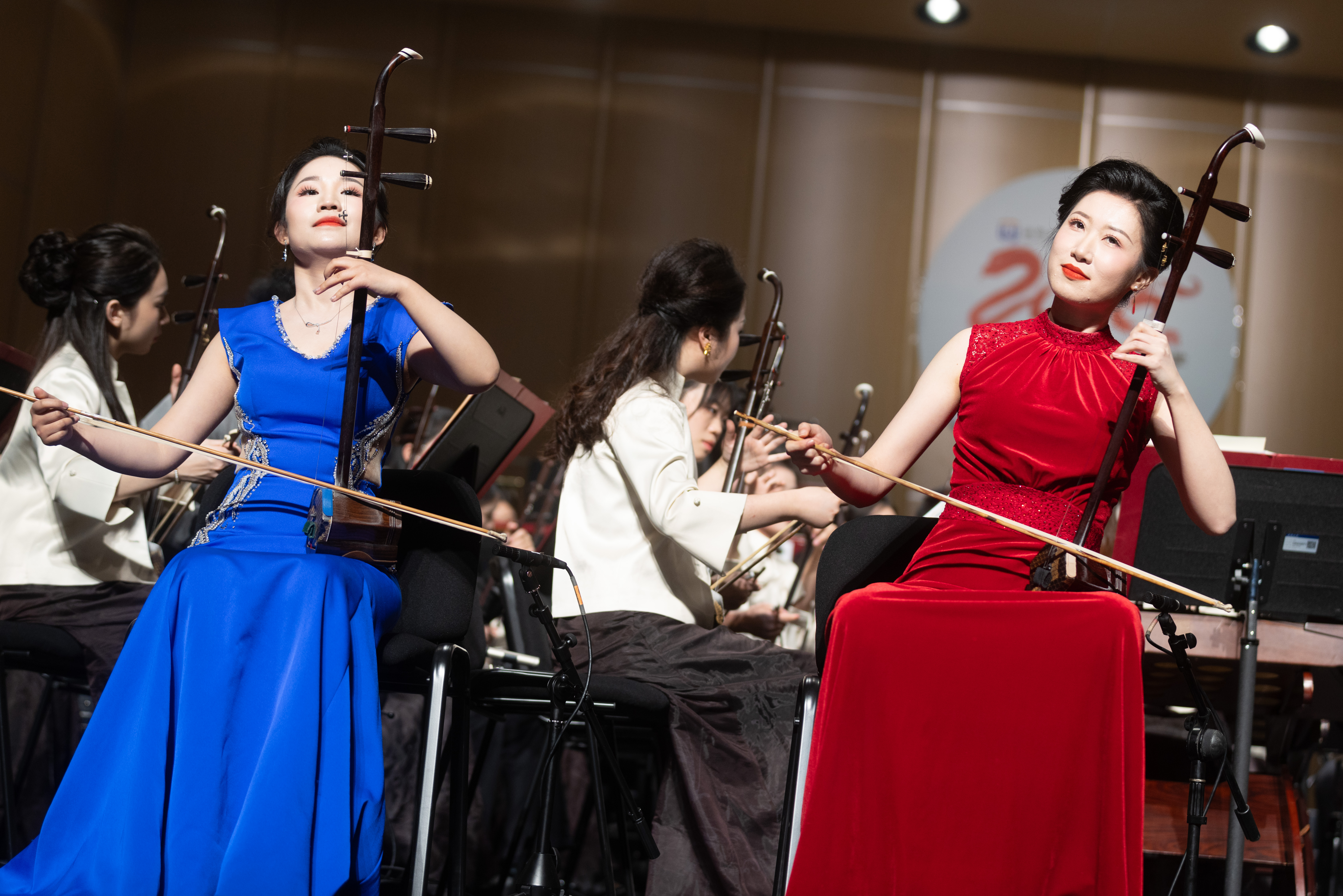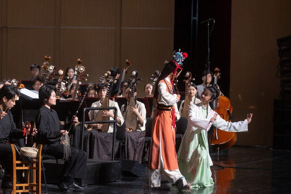 音乐会在《金蛇狂舞》的热情洋溢中拉开序幕,这首民族管弦乐以其鲜明的特色预示着新年的活力与希望。随后,一曲《雪意断桥》以其生动的笔触描绘了江南美景以及对人世间温情的赞美;戏剧系越剧专业学生陈佳慧以越剧演唱方式改编流行音乐《花妖》,与学生陈珂菡共同演唱越剧《天上掉下个林妹妹》,展现了当代青年对传统文化的传承与创新;罗小慈作曲作品《律动》由浙音民族室内乐团古筝演奏家楼琳与乐队合作演奏,创新采用多种艺术手法,展现了古筝丰富的音乐内涵和震撼的气势;浙音副教授刘宇、青年二胡演奏家裴文钰和乐队合作演奏了刘天华的经典作品《良宵》,该曲旋律悦耳动听,展现了与朋友共度守岁时光的欢乐和对未来的美好憧憬。