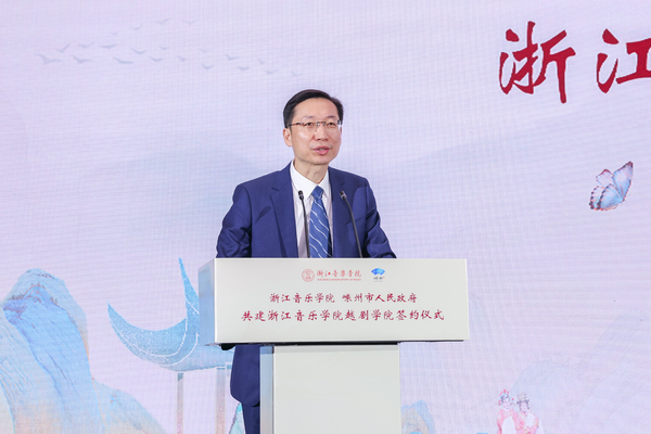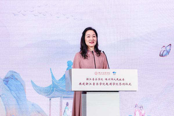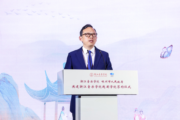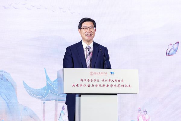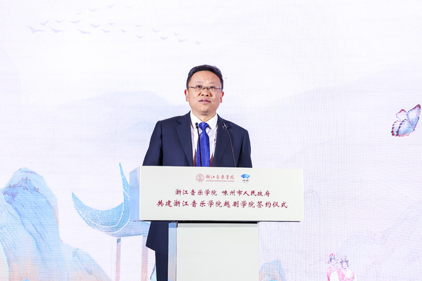 裘建勇在致辞中指出,嵊州始终牢记习近平总书记关于“繁荣发展越剧艺术事业”的重要指示,创设“十个一”越剧保护传承发展机制,创成省级越剧文化生态保护区,书写了“越嵊州越有戏”的精彩华章。越剧学院的成立是越剧发展的重要里程碑,标志着越剧教育实现了从“越剧之家”到“越剧艺校”,再到“越剧学院”的时代变迁,为百年越剧在新时代精彩蝶变奠定了坚实基础,也必将对中国戏曲教育发展产生巨大影响。嵊州将持续强化“越剧之乡”的使命担当,全力保障越剧学院建设,加快创设越剧十三流派工作室,与浙音携手打造中国越剧文化“朝圣地”,让越剧在发源地不断传承创新、发扬光大。