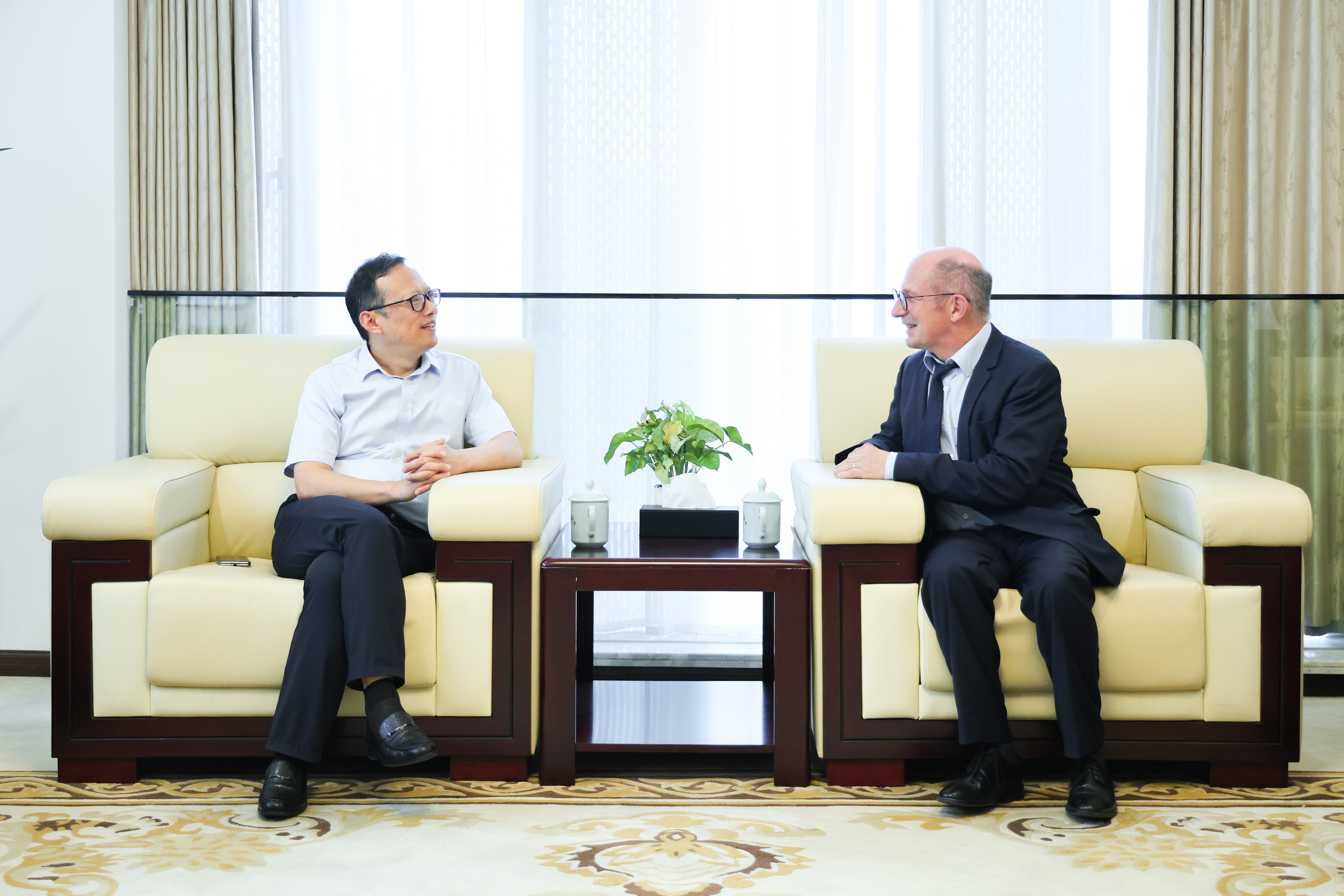 王瑞对高石一行表示热烈欢迎,并详细介绍了浙音的总体发展和国际交流情况。他指出,中法两国历史悠久、文化灿烂,音乐作为跨越语言的艺术形式,始终是两国人文交流的核心纽带。浙音自成立以来便将国际交流作为高质量发展的重要路径,法国作为欧洲音乐文化的重镇,在古典音乐传承、现代电子音乐创新等领域积累了深厚底蕴,这与浙音“推动音乐创新、培养国际化人才”的办学理念高度契合。王瑞强调,浙音始终致力于推进国际化办学,希望在法国驻上海总领馆的推动下,能与法国顶尖音乐院校、知名艺术家建立常态化交流机制,并提议双方可依托中法历史文化重要时间节点——如经典作曲家诞辰、重大文化纪念日等,联合策划举办高水平演出活动,推动中法音乐艺术交流互鉴、繁荣发展。