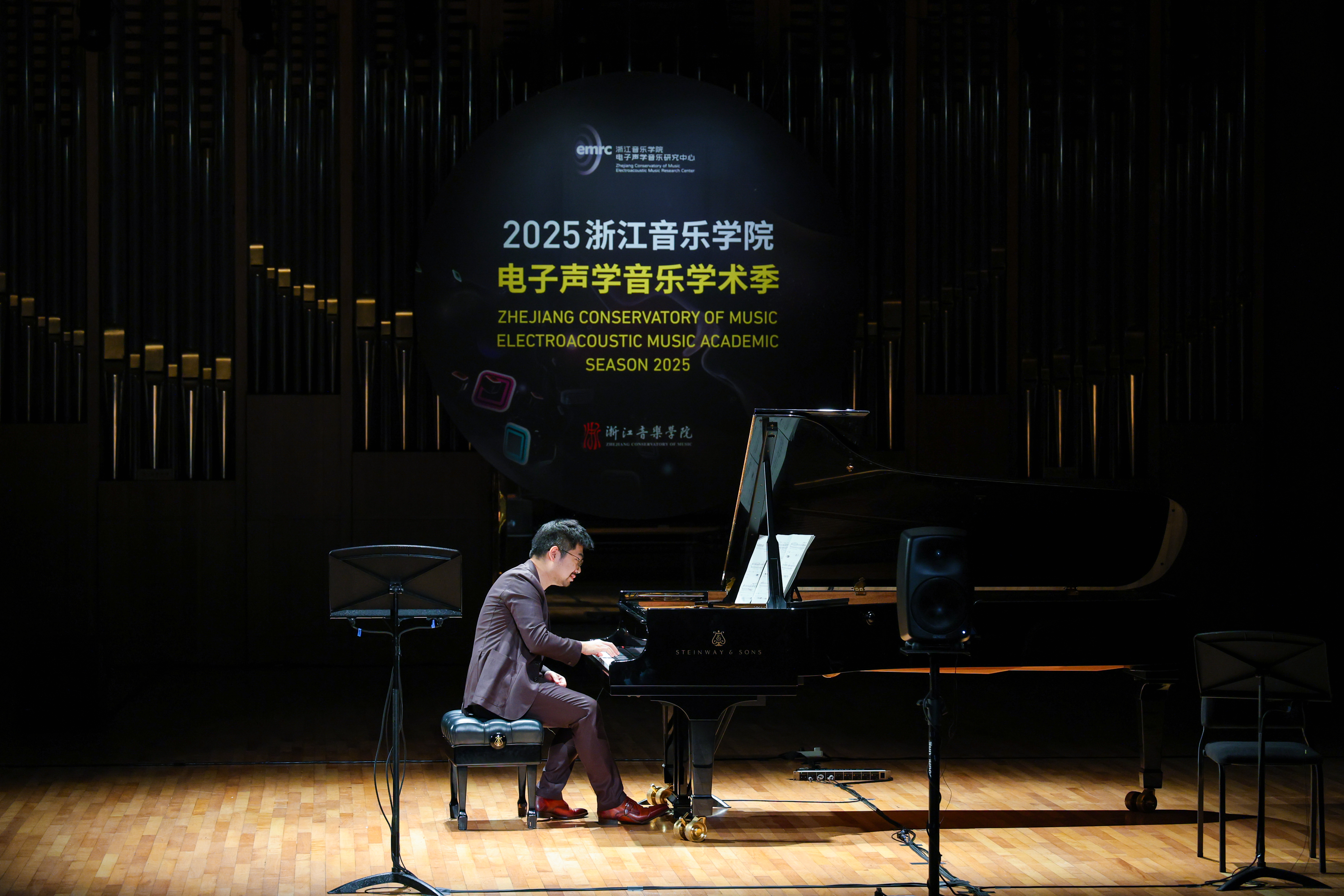 首场“中外作曲家作品音乐会”随即上演,共演绎了韩国作曲家吳藝敏、中国作曲家王甜甜、意大利作曲家拉拉·莫尔恰诺、中国作曲家艾尼瓦尔·瓦吉丁、法国作曲家何塞·米格尔·费尔南德斯,以及中国作曲家安承弼教授所创作的6部电子音乐作品:《迷人的耳鸣》为小提琴与电子音乐而作、《零维空间》为独奏小号与5.1环绕系统而作、《嵌入的缠结》为长笛与实时电子音响而作、《原野的细语》为琵琶独奏与电子音乐而作、《日晷》为小号与沉浸式实时电子音乐而作、《格调》为钢琴独奏和电子音乐而作。6部混合电子音乐作品生动描绘了技术与艺术交融的动人图景,为本次音乐学术季活动开启了精彩序幕。